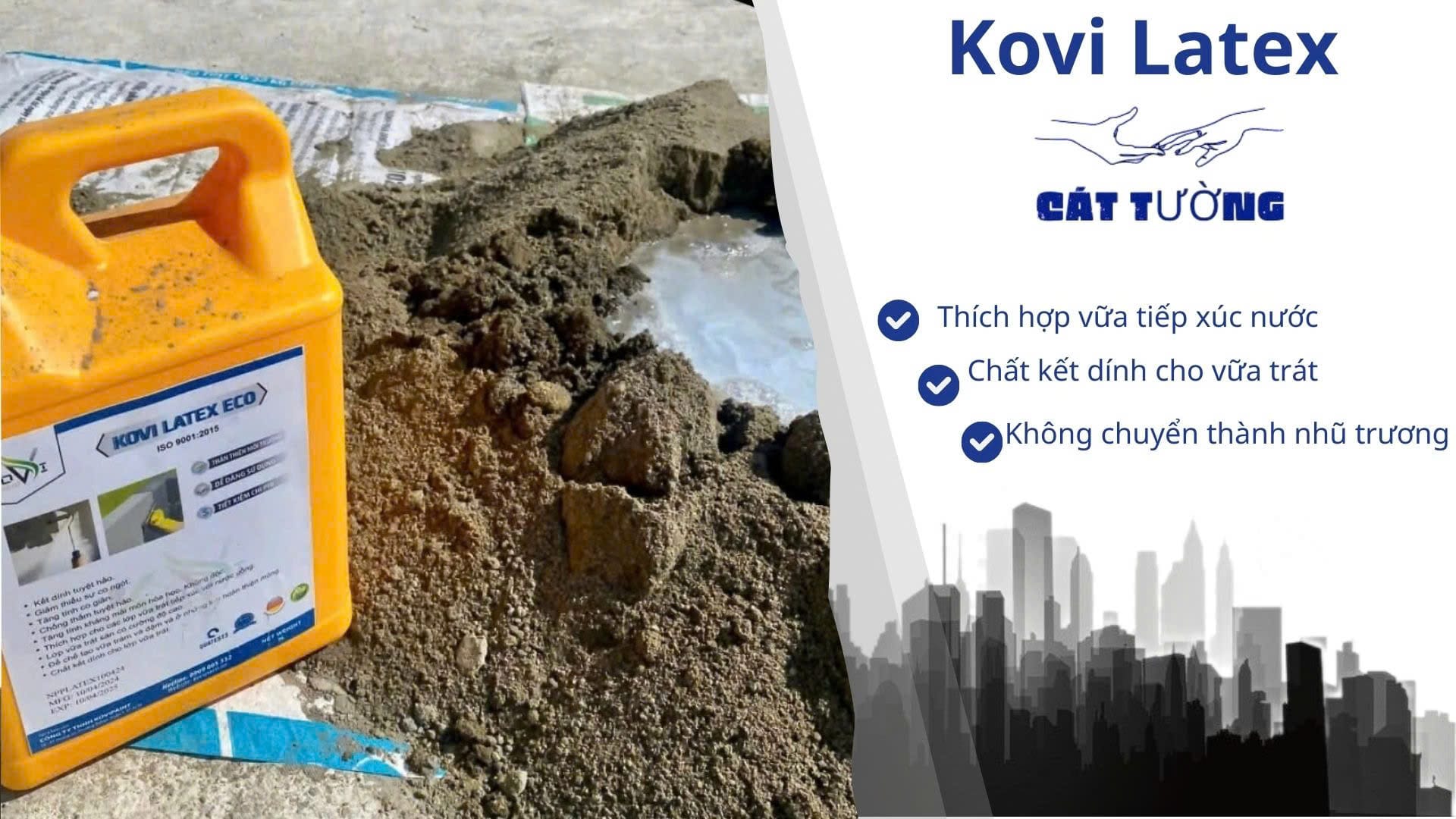 Tỉ lệ trộn: Xi măng : Cát = 1 : 3 (A), Kovi Latex : Nước = 1 : 3 (B). Rót hỗn hợp (A) vào (B) và trộn đến khi đạt độ sệt thích hợp.
