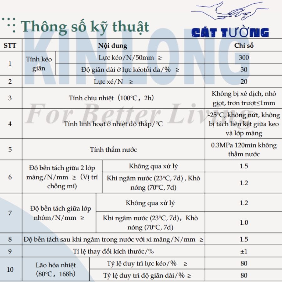 Chống thấm kinlong có lớp cao su Butyl có thể đảm bảo độ kín khí tốt và có thể đạt được độ bám dính hoàn toàn 100%. Với lớp nền mà không cần lớp lót